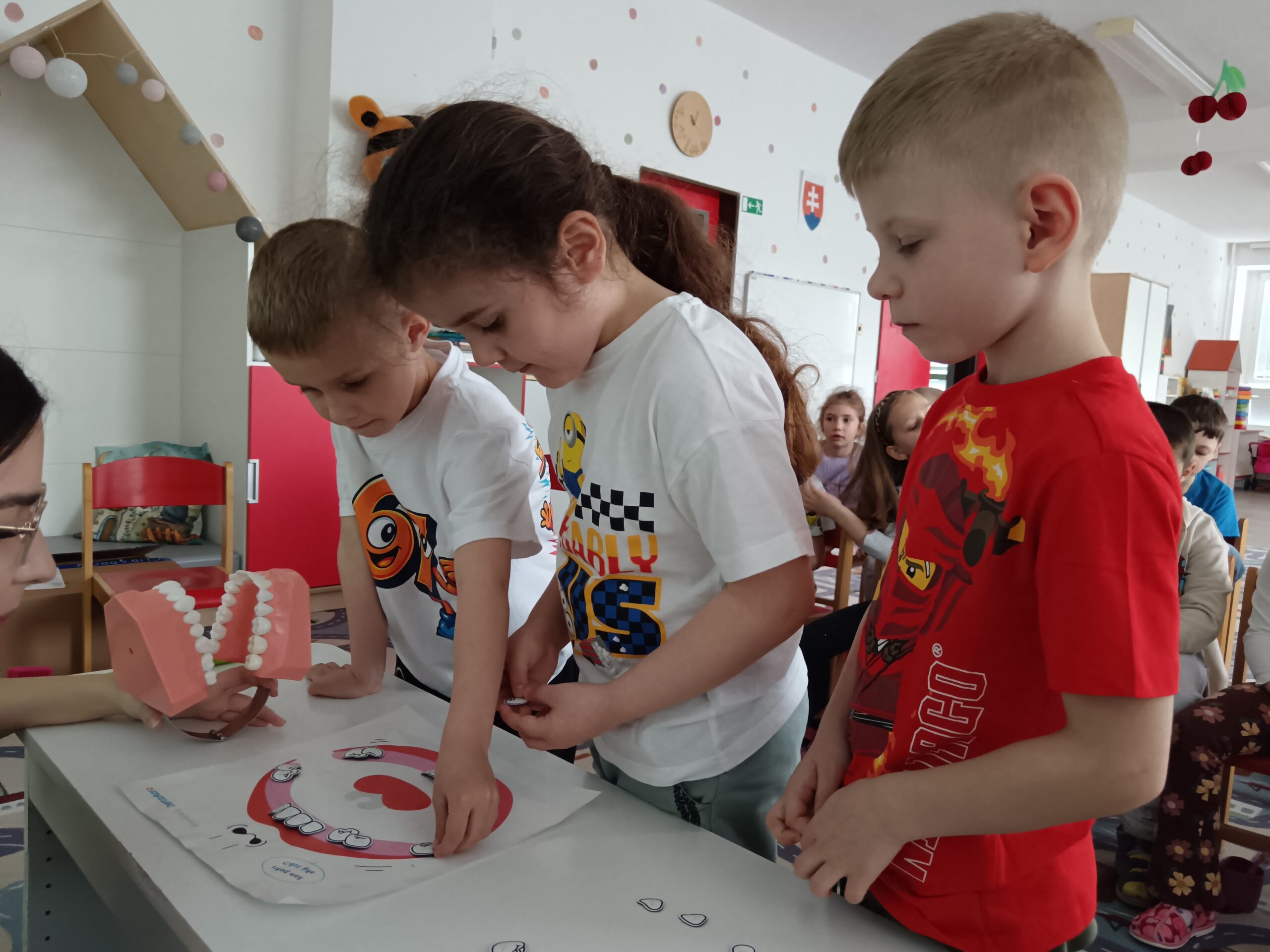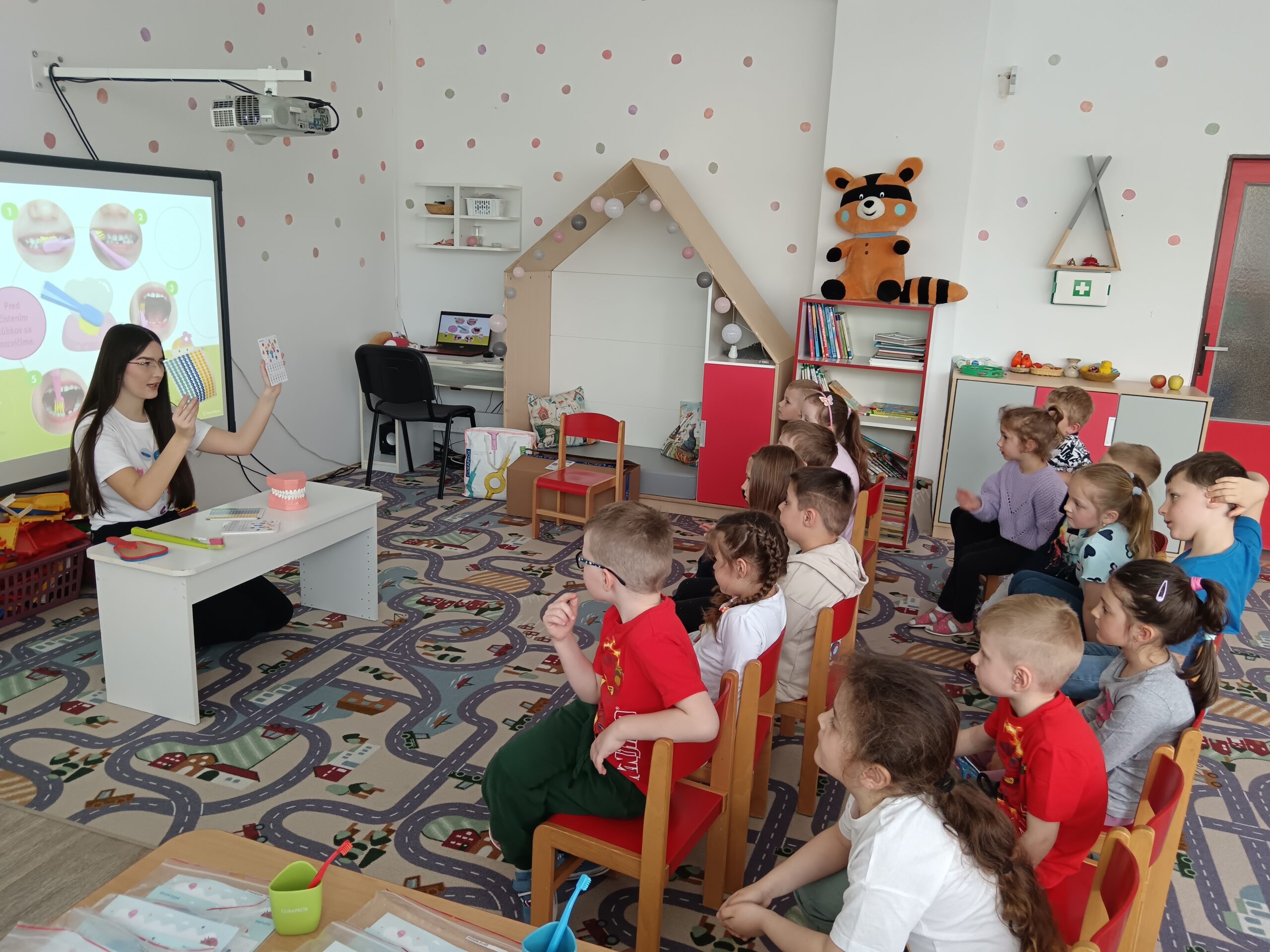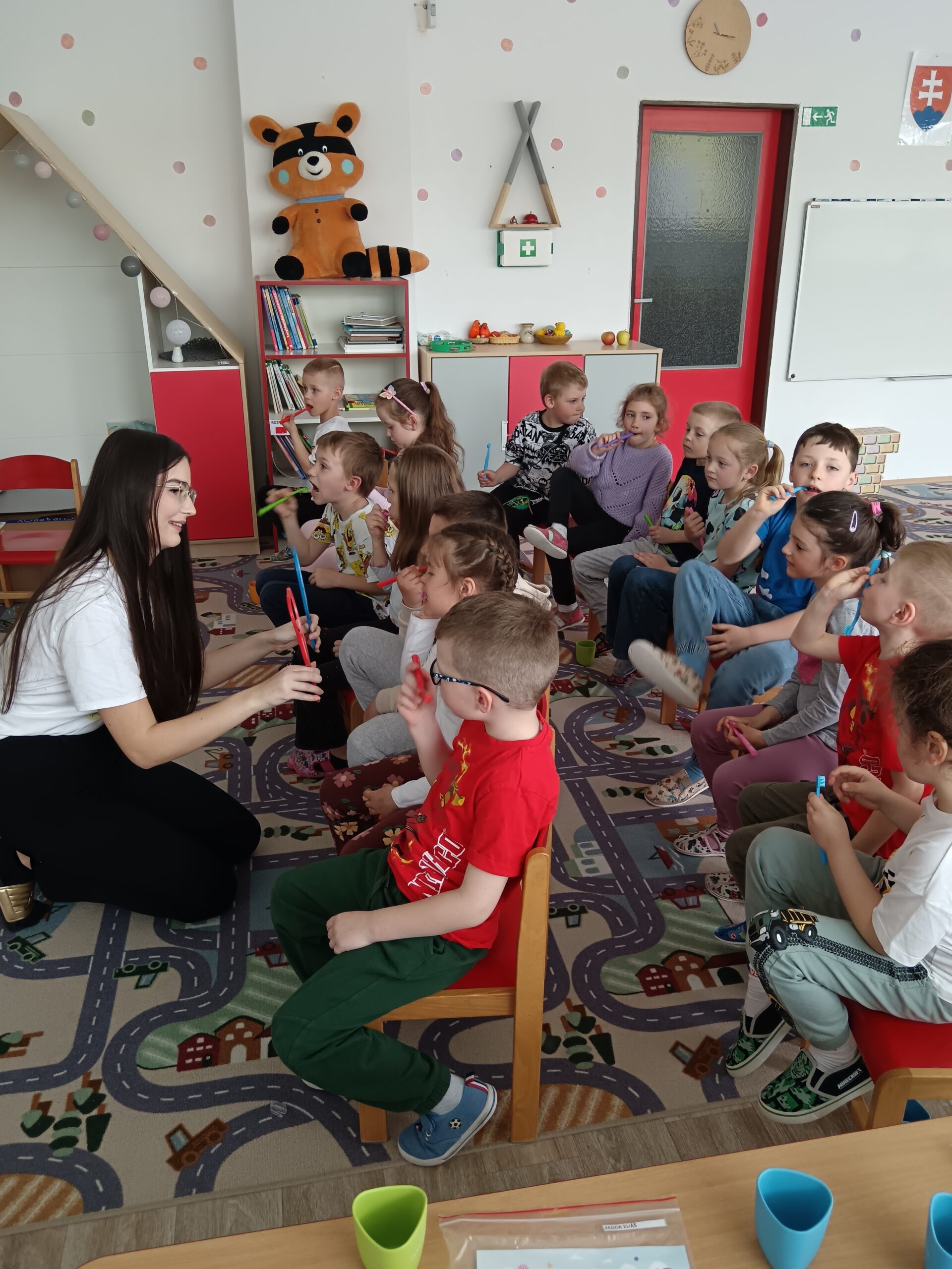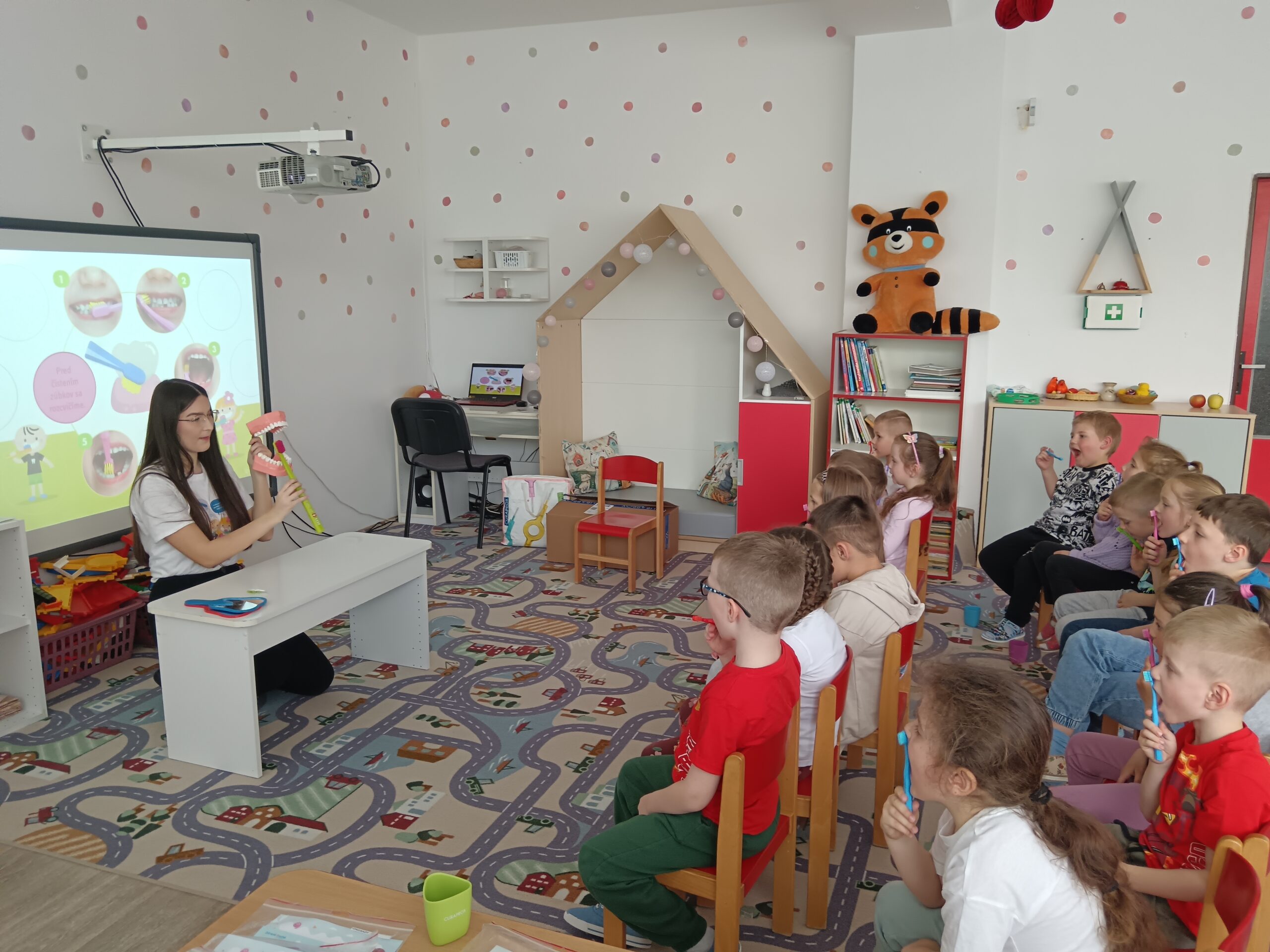 Dňa 16.4.2026 nás už druhýkrát navštívila milá študentka z Dentálnej hygieny. Pre deti si pripravila zaujímavé a poučné aktivity o starostlivosti o zúbky. Deti sa hravou formou dozvedeli, ako správne čistiť zuby, čo zúbkom prospieva a čo im škodí. Prezreli si aj zubárske pomôcky a model zuba.